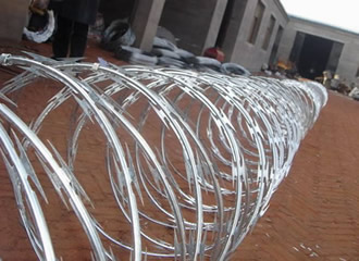 Razor barbed tape is a kind of modern security fencing materials fabricated with razor-sharp steel blade and high-tensile wire. Barbed Tape can be installed to achieve the result of frightening and stopping to the aggressive perimeter intruders, with piecing and cutting razor blades mounted at the top of the wall, also the special designs making climbing and touching extremely difficult. The wire and strip are galvanized to prevent corrosion.